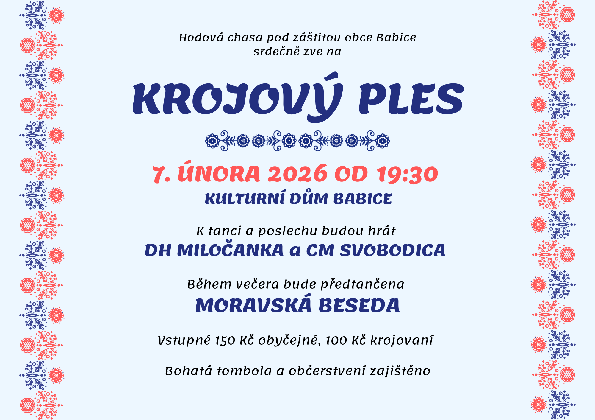 Hodová chasa pod záštitou obce Babice zve na Krojový ples, na kterém bude předtančena nejen babickými krojovanými moravská beseda, k tanci a poslechu budou hrát DH Miločanka a CM Svobodica. Na příchozí čeká bohatá tombola, vínko a různé pochutiny.