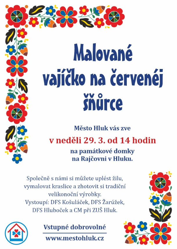 Pletení pomlázek, voňavá škvařežina na chlebu, malování vajíček a velikonoční dílničky – to vše vás čeká v našich krásných památkových domcích. Těšit se můžete i na vystoupení hluckých dětských folklorních souborů a cimbálové muziky. Přijďte se naladit na velikonoční svátky tak, jak se patří!