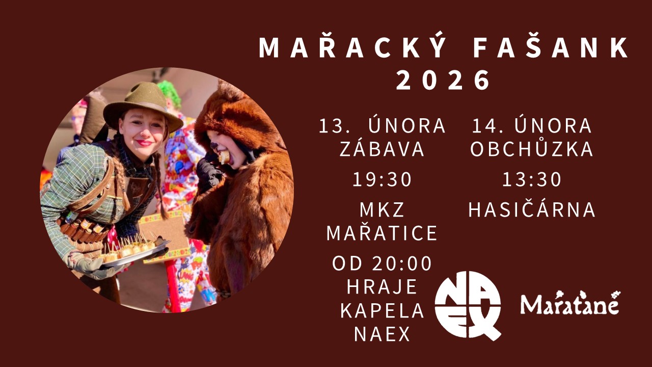 Přijměte naše srdečné pozvání na fašankové veselí, které se v Mařaticích uskuteční od pátku 13. 2. 2026.