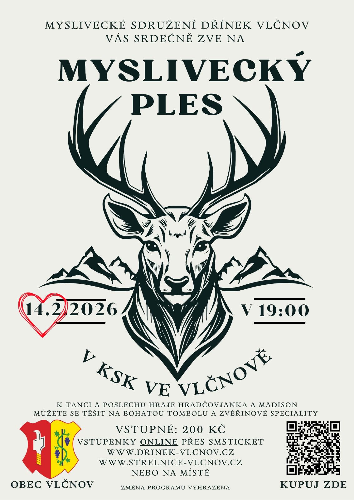 Myslivecký spolek Dřínek vás srdečně zve na Myslivecký ples, který se uskuteční v sobotu 14. února od 19 hodin v Klubu sportu a kultury Vlčnov. K tanci a poslechu zahraje Hradčovjanka a Madison. Těšit se můžete na bohatou tombolu a myslivecké speciality.