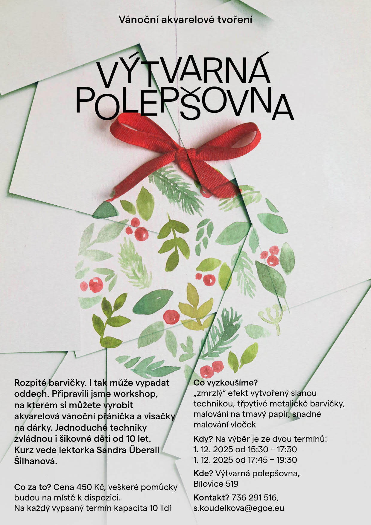 Nechte se ve Výtvarné polepšovně v Bílovicích unést na pestrobarevné paletě sváteční nálady. Pod vedením zkušené lektorky Sandry Šilhanové si vyrobíte akvarelová vánoční přáníčka a visačky na dárky. Zvládnou to i šikovní mladí tvůrci od 10 let. Přijďte si sami vyzkoušet kouzlení s akvarelem a rozpouštění nádherných barev po papíře.